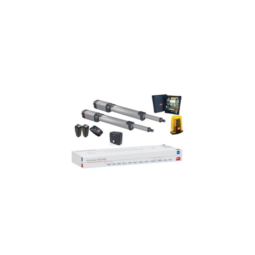 bft – kit de motorisation 24v dc pour portails battants jusqu’Ă 2,5 m ( 400 kg ) kustos ultra bt kit a25  24v dc r935308 00004 – 2 moteurs 24v dc Ă©lectromĂ©caniques kustos ultra bt a25 24v dc- 1 thalia armoire de commande- 1 tĂ©lĂ©commande 4 canaux en 433,92 mhz mitto b rcb04 r1- 1 paire de photocellules desme a15- 1 clignotant radius b lta 24 r1 – 1 sĂ©lecteur Ă Â clé q.bo key wm-  1 plaque portailÂ