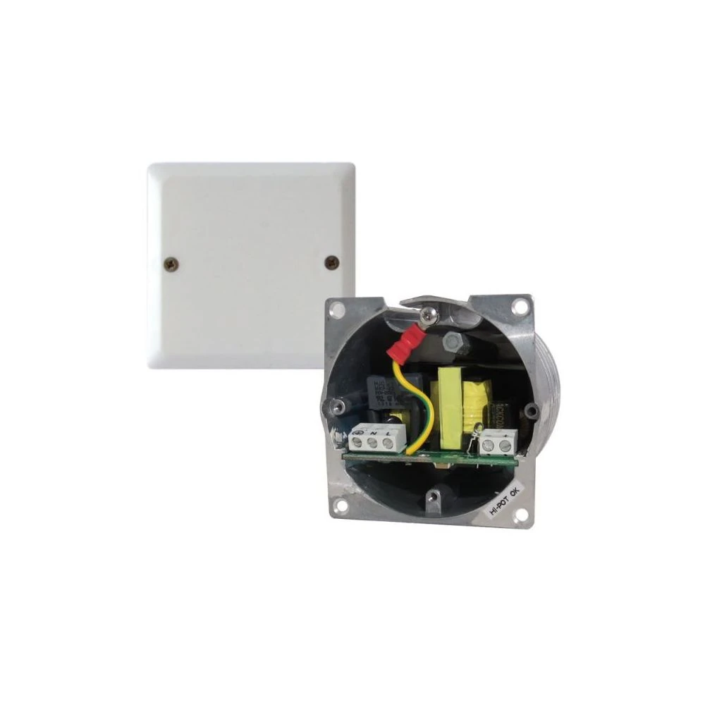 BoĂźtier encastrable pour cloison sĂšche permettant de crĂ©er un point d’alimentation 24 volts Ă partir d’une tension d’entrĂ©e de 230 volts, tout en gardant un format standard. UtilisĂ© pour tous les systĂšmes d’ouverture et fermeture.
