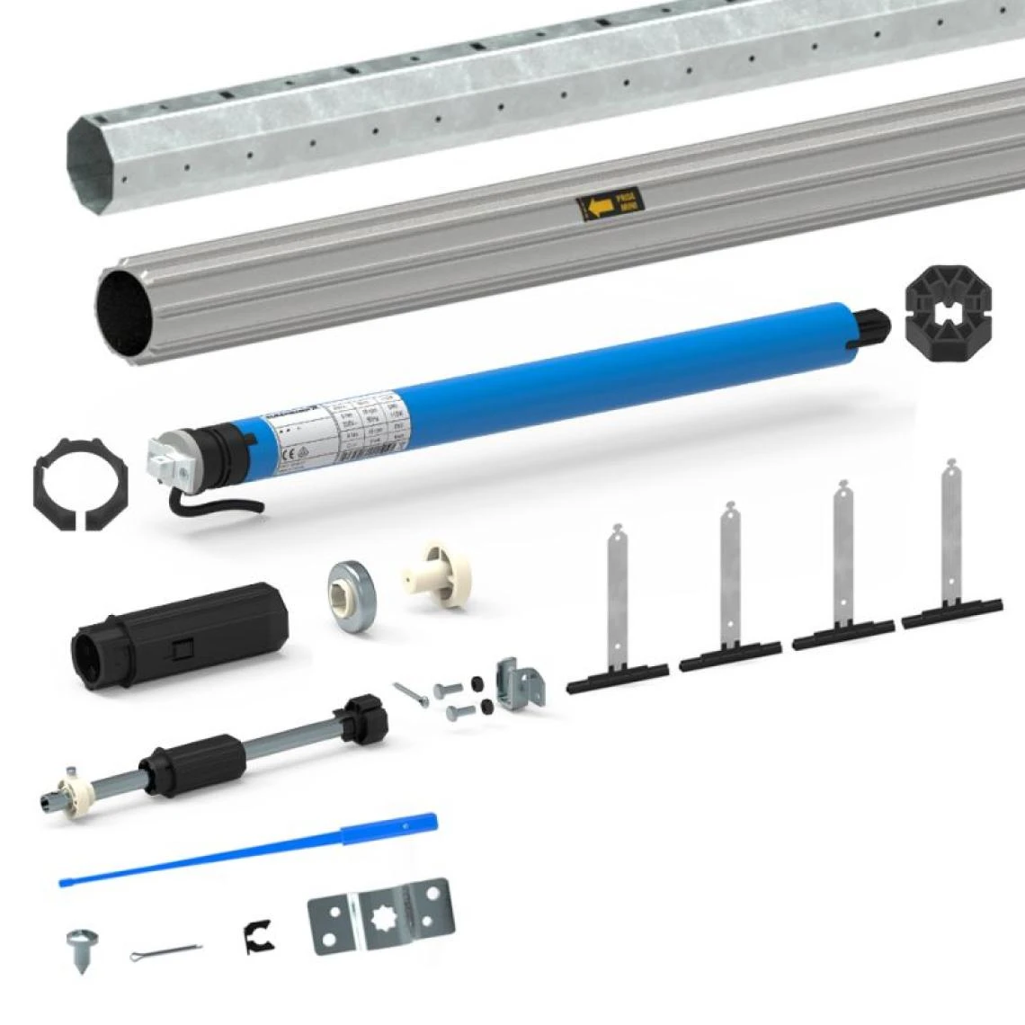 Le moteur filaire, placé dans un tube octogonal téléscopique de 40 mm de diamÚtre, entraßne le tablier grùce aux attaches à clipper pour lames de 8 mm fournies dans le kit.